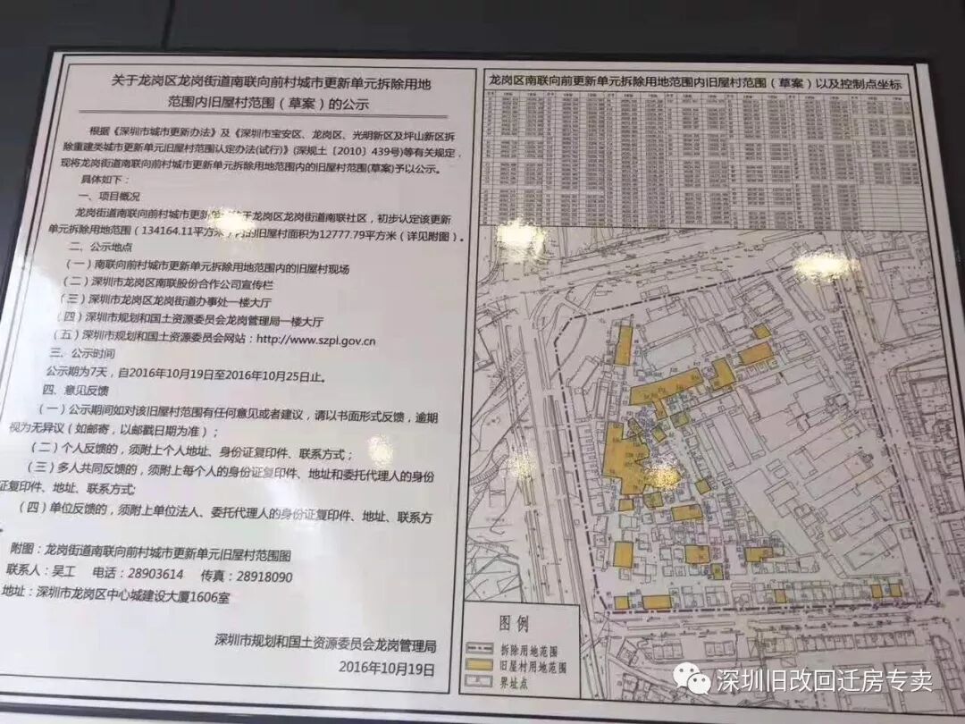 根据《深圳市城市更新办法》及《深圳市宝安区、龙岗区、光明新区及坪山新区拆除重建类城市更新单元旧屋村范围认定办法(试行)》(深规土〔2010〕439号)等有关规定,现将龙岗街道南联向前村城市更新单元拆除用地范围内的旧屋村范围(草案)予以公示。具体内容如下: