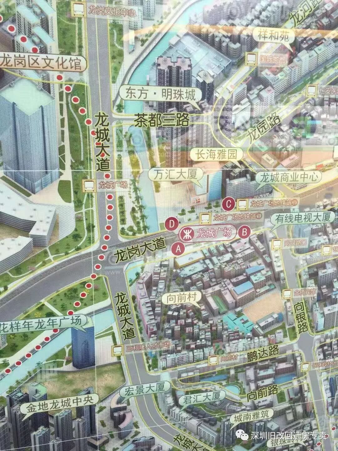 位于龙岗大道地铁3号线龙城广场站南侧,东至向银路,南至鹏达路,西至龙城南路,北至龙岗大道。项目占地12.2万平方米,总建筑面积约70万平方米。项目已经立项,拆迁进行中。